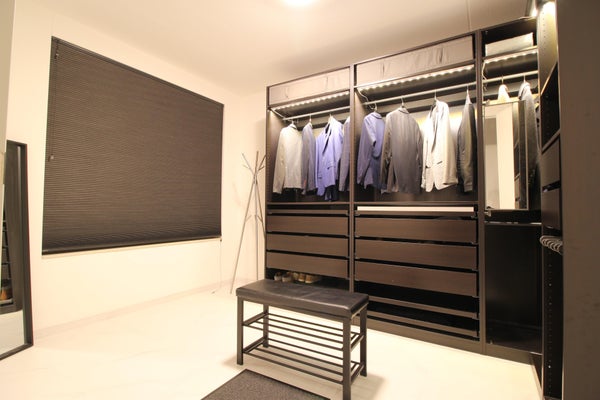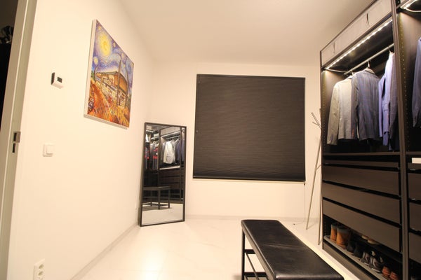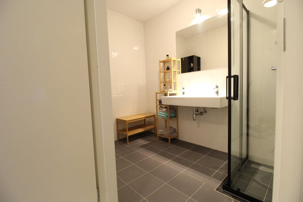 The apartment has two bedrooms: a generous master bedroom and a second room that can be flexibly used as a guest room, home office, or walk-in closet. The modern bathroom is fitted with a walk-in shower and double washbasin, and there is a separate toilet.