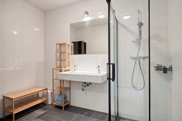 The apartment has two well-sized bedrooms, the first suitable as a master bedroom with a workstation by the window, the second as a children’s room, home office or a dressingroom. The bathroom is luxuriously finished and equipped with a shower, double washbasin and underfloor heating.
