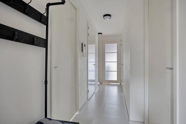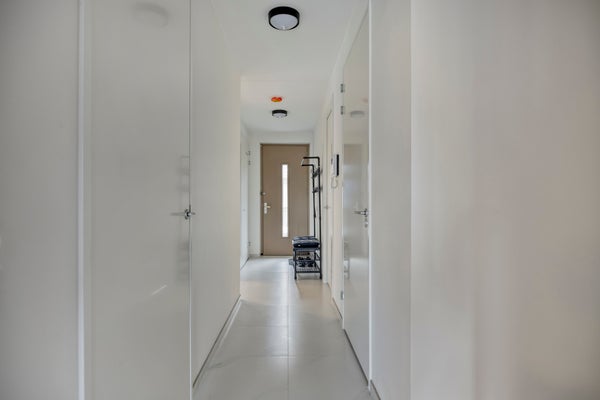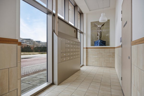 The apartment is accessed via a central entrance with video intercom and elevator. Upon entering the apartment, you arrive in the hallway, which provides access to all rooms of the apartment. The hallway also gives access to a separate toilet and a utilityroom/storage with the washingmachine.