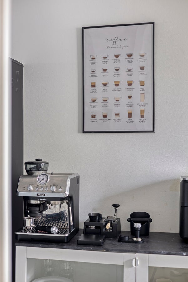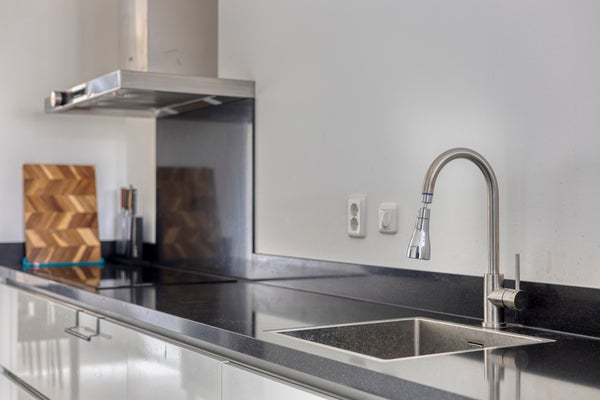 The open-plan kitchen is modern and fully equipped with built-in appliances, including a combi steam oven, ceramic hob with extractor hood, dishwasher, refrigerator, freezer, airfryer and coffee machine. The open layout creates a pleasant connection between cooking, dining and relaxing.