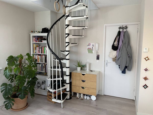 From the living room, a fixed spiral staircase leads to the third floor. Sleeping area with space for a double bed and a wardrobe. Hallway with space for a desk, ideal to set up as a workspace. Neat bathroom with washing machine connection.