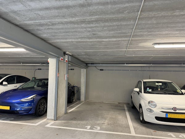 Under the complex is a parking garage with one parking space belonging to the apartment. There is also a bicycle shed.
