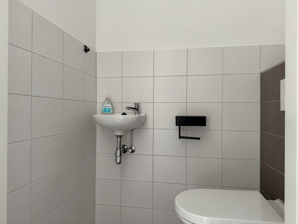 The apartment is accessible via the gallery. The front door opens into the hallway, which provides access to the meter cupboard, a storage cupboard with the washing machine/dryer connection and the mechanical ventilation system, the toilet, the living room, and the bedroom. The living room offers beautiful views through two large windows and is therefore very bright. The modern open-plan kitchen is fully equipped, including a refrigerator with freezer, a combination microwave oven, a dishwasher, an induction hob, and an extractor fan. The bedroom is located on the gallery side and provides access to the bathroom, which is equipped with a shower, a vanity unit, and a designer radiator.
