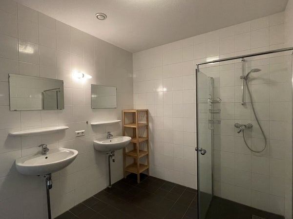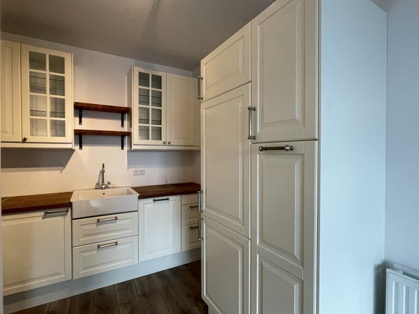 The apartment has two bright bedrooms, also ideal as a comfortable office. The neat bathroom features a shower, sink, and designer radiator. Additionally, there is a separate toilet with a sink and a spacious laundry and storage area with a combi boiler and connections for a washing machine and dryer.