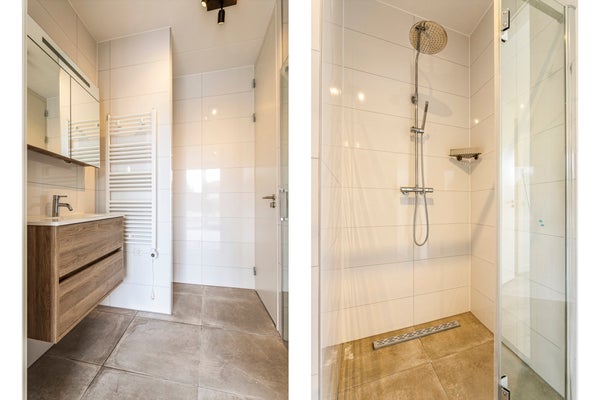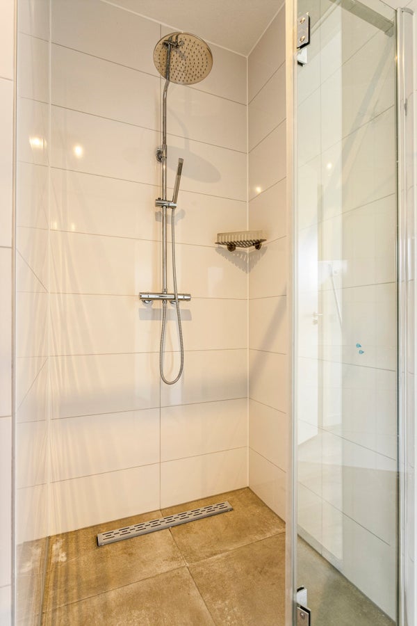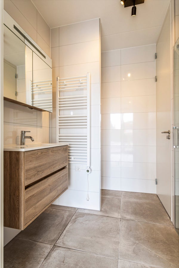 Entrance flat, hallway with separate toilet with hand basin and technical room to spacious living room with open kitchen with all appliances, including fridge-freezer, dishwasher, induction hob and extractor. From the hallway entrance to the front bedroom with bathroom equipped with hand shower plus rain shower and modern washbasin furniture plus design radiator. The bathroom is also equipped with a washing machine connection and a dryer.