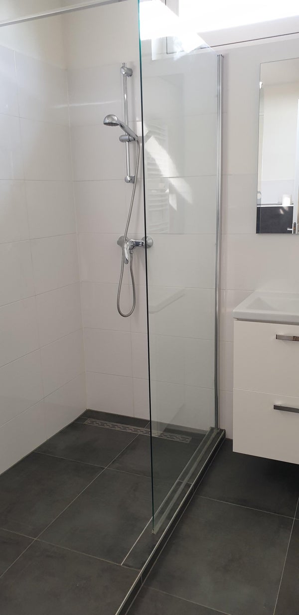 The bathroom is equipped with a wall toilet, designer radiator, and walk-in shower with thermostat faucet. The bathroom is almost fully tiled.