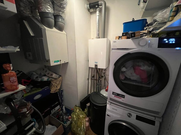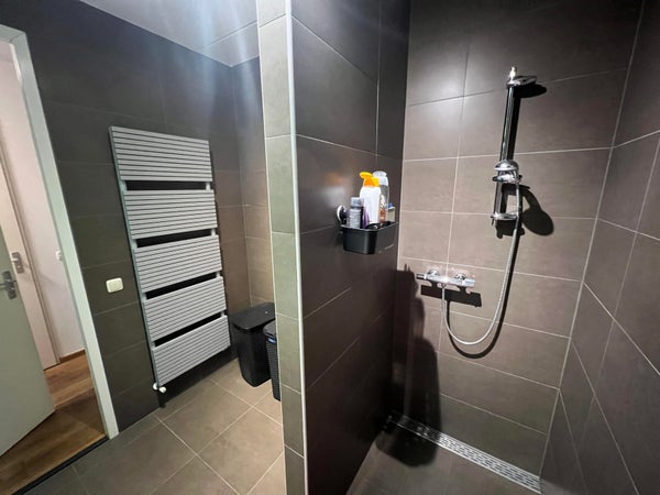 The bathroom is modern and timeless, equipped with a generous walk-in shower, vanity unit, ample storage, and a towel radiator. The toilet with a small sink is also located in the hall.