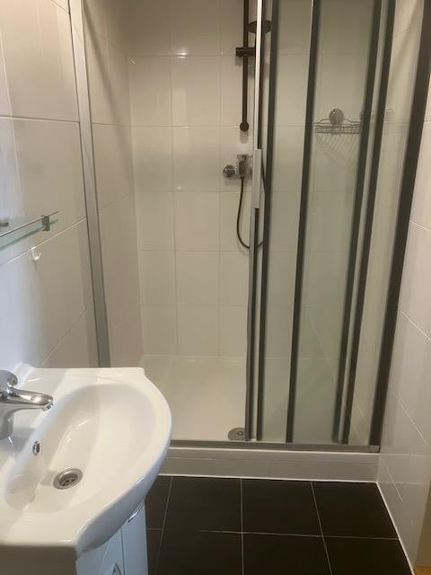 Stylish spacious bathroom featuring shower, sink, and toilet.