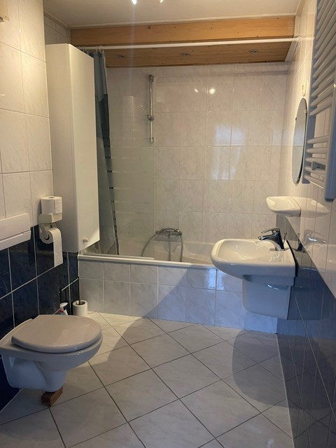The property is situated on the second floor. Here you will find a spacious living room with an open-plan kitchen, equipped with various built-in appliances. The rooftop terrace can be accessed directly from the kitchen. The bathroom, featuring a toilet, washbasin, and bathtub, is also located on this floor.
