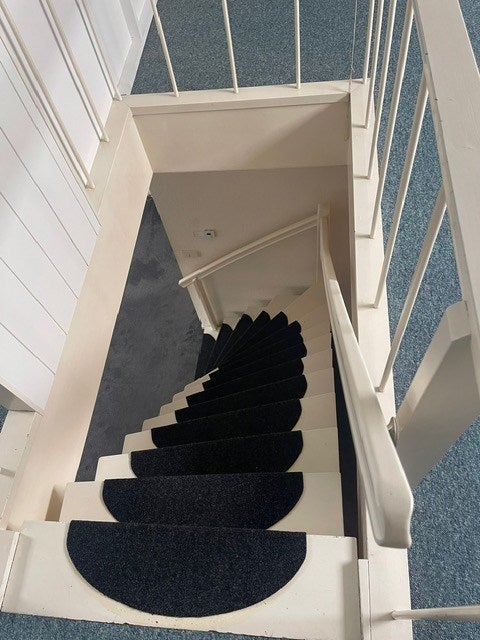 Via the stairs, you reach the upper level where the bedroom is located. The bedroom also includes an additional washbasin.