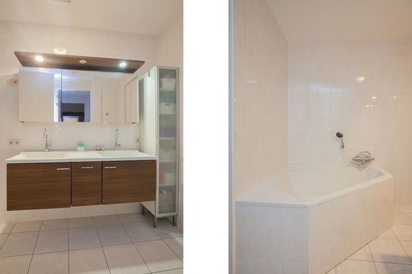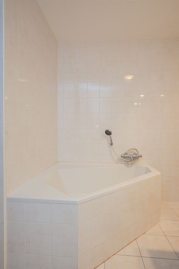 The laundry room can also be reached from the hall, which also gives access to the bathroom. The laundry room is fully tiled, as is the bathroom. The bathroom has a corner whirlpool bath, a walk-in shower and a double sink.