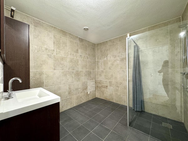 The spacious kitchen is equipped with contemporary built-in appliances and blends seamlessly with the stylish finish of the apartment. The bathroom is neatly finished and fully tiled. The apartment also has an internal storage room with connections for a washing machine and dryer.