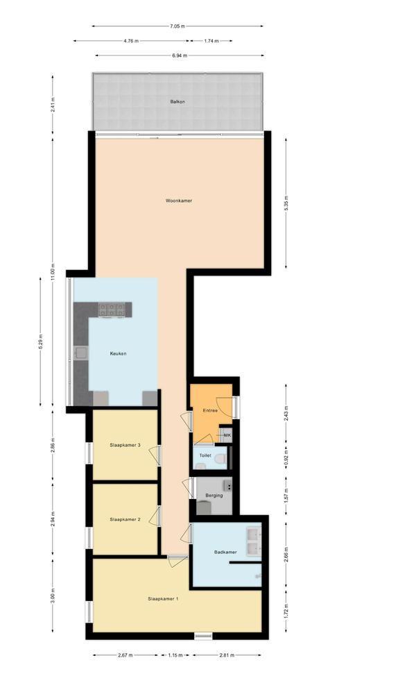 Through the hall with wardrobe and toilet, you reach the very spacious living room with open kitchen, which forms the heart of the apartment. The living room feels open and light and has direct access to the spacious balcony. An ideal setting for a cup of coffee or a cozy dinner in the evening.