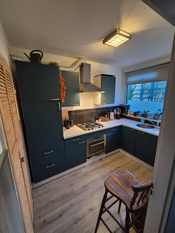 The kitchen has a neat and modern appearance. In the adjoining space (with washing machine connection and boiler), neat wooden louver doors have been installed, providing a clean finish. The bathroom is well-maintained and functionally arranged.