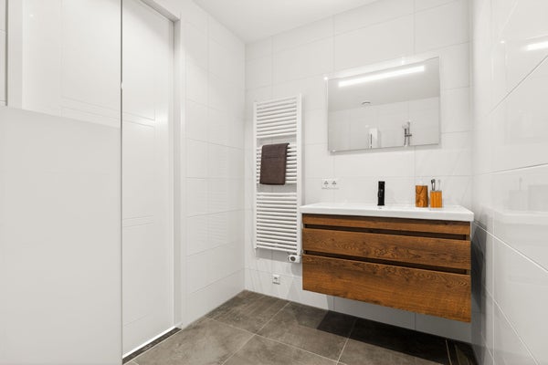 L'appartamento dispone di due ampie camere da letto. Il bagno è modernamente arredato ed è dotato di un WC, doccia e lavabo. Inoltre, l'abitazione dispone di una lavanderia separata. L'abitazione è rifinita con materiali di alta qualità ed è pronta per essere abitata immediatamente.