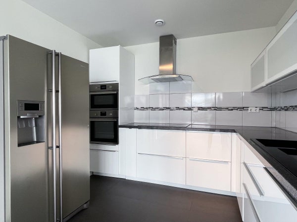 Le grandi finestre permettono un'abbondante luce naturale e, se desiderato, aria fresca. La cucina a vista è dotata di una cucina su misura a forma di L con piano di lavoro in pietra e vari elettrodomestici integrati come lavastoviglie, piano cottura a induzione, forno, microonde combinato, frigorifero indipendente e moderna cappa di aspirazione.