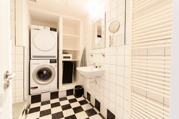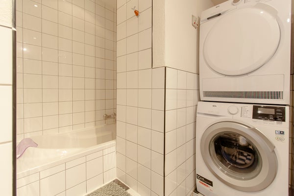 Il bagno è dotato di lavatrice, asciugatrice e vasca con doccia. L'appartamento dispone anche di un bagno separato.