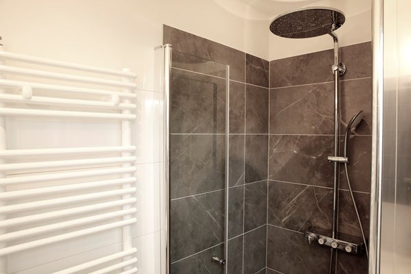 Il lussuoso bagno è dotato di doccia a pioggia, radiatore di design e lavabo.