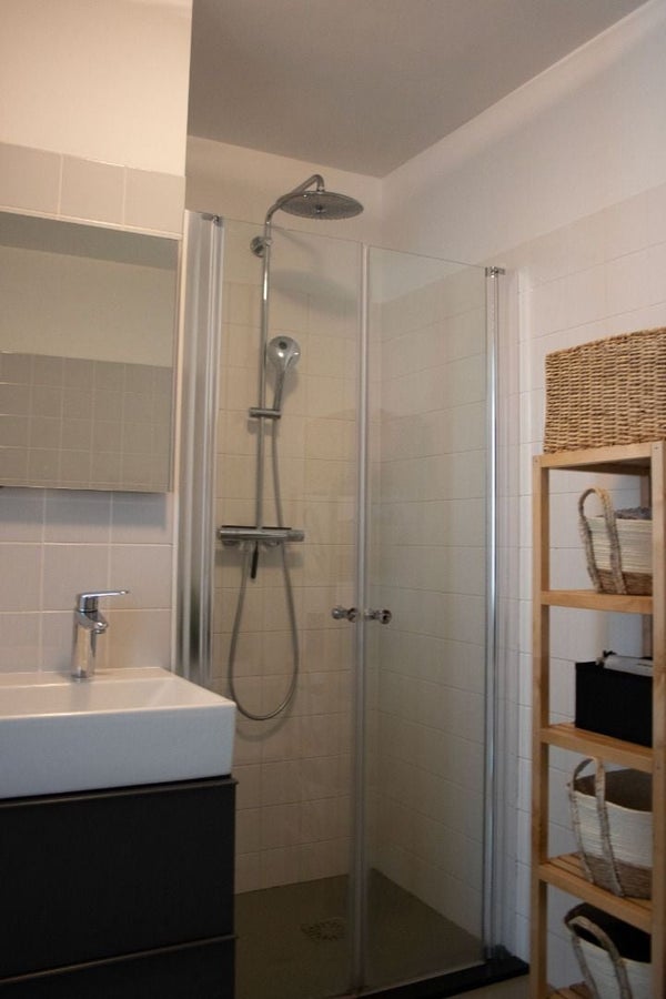Bagno: bagno moderno con doccia, lavabo e WC.