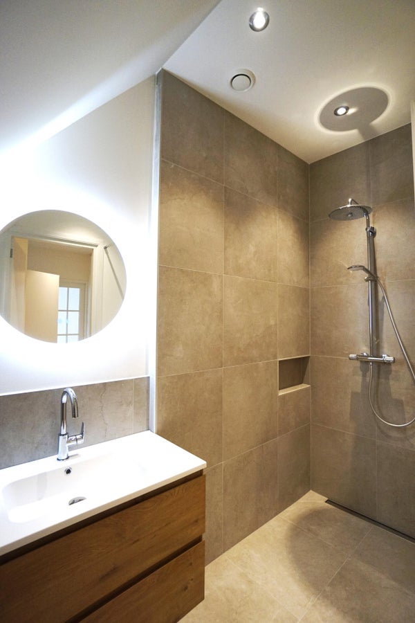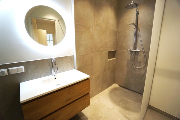 Il bagno spazioso è dotato di un mobile lavabo e una doccia walk-in. Qui si trovano anche le connessioni per la lavatrice e l'asciugatrice.