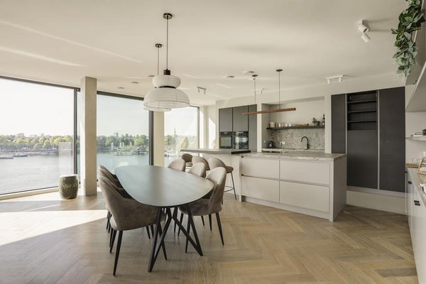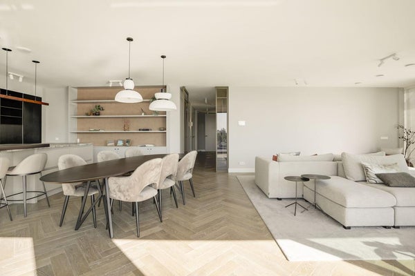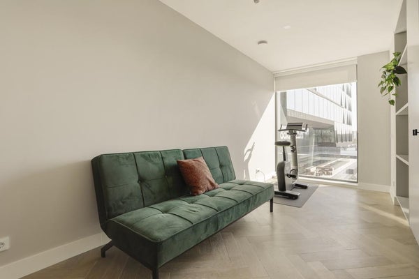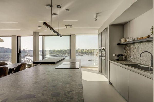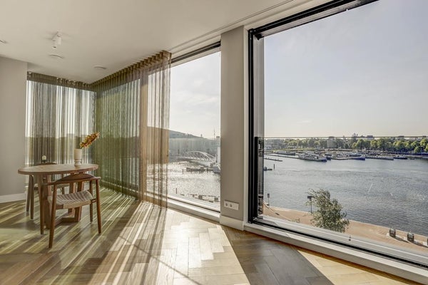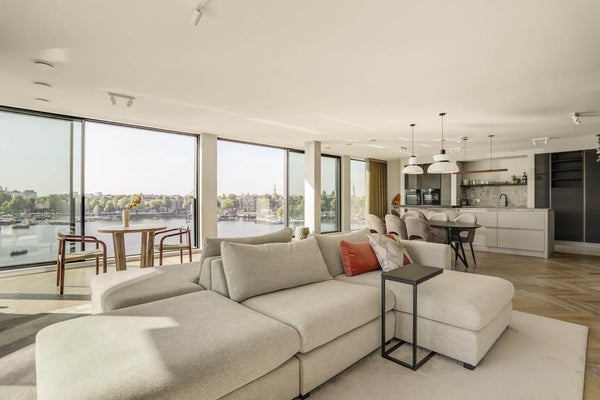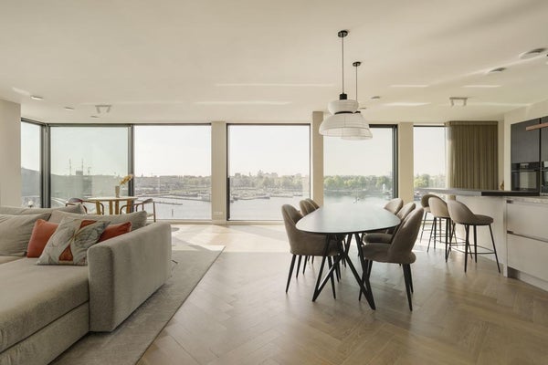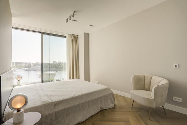 DISPOSIZIONE Ingresso comune elegante con scala e ascensore al secondo piano. Entrerete nel corridoio con armadietto elettrico, guardaroba e spaziosi servizi igienici separati con fontana. Le grandi finestre rendono la casa meravigliosamente luminosa e regalano una vista unica su Amsterdam. La posizione angolare a sud e le grandi finestre apribili su 2 lati della casa offrono vedute dinamiche e soleggiate da ogni parte. Il balcone spazioso è adiacente al soggiorno e accessibile tramite porte scorrevoli. La lussuosa cucina a vista è dotata di un'isola di cottura con bar e di tutti gli elettrodomestici incorporati; frigorifero, congelatore, forno combinato, forno a vapore combinato, scaldapietanze, lavastoviglie, piano cottura a induzione con sistema di estrazione integrato e Quooker. Ci sono anche più che sufficienti spazi di lavoro e armadietto. Ci sono 3 camere da letto spaziose. La camera principale è dotata di un letto matrimoniale, un grande armadio a muro con scrivania. La seconda camera ha anch'essa un letto matrimoniale e diversi armadi a muro. La terza camera può essere utilizzata come studio ma è anche dotata di un divano letto per gli ospiti. Il bagno principale è lussuosamente rifinito in colori caldi e neutri ed è dotato di una vasca, doccia a piastrelle, doppio lavabo con mobile, secondo wc, radiatore di design e riscaldamento a pavimento. Il secondo bagno è dotato di una doccia a piastrelle, doppio lavabo con mobile, radiatore di design e riscaldamento a pavimento.