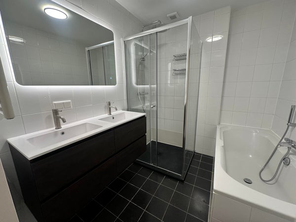 Il bagno è stato recentemente migliorato. È dotato di una vasca, una spaziosa doccia a pioggia e a pavimento, e di uno specchio moderno con funzione di riscaldamento e illuminazione.