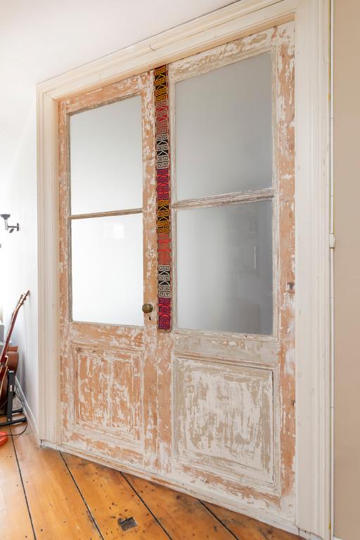 Adiacente al soggiorno c'è la camera da letto principale, dotata di un letto matrimoniale e di un armadio. Bellissime finestre in vetro colorato creano una luce speciale e colorata nella stanza nei giorni di sole.