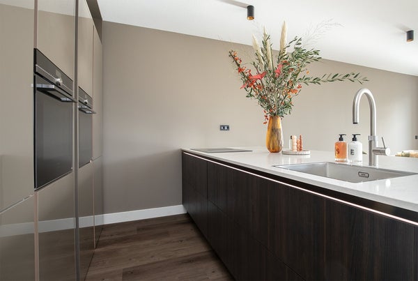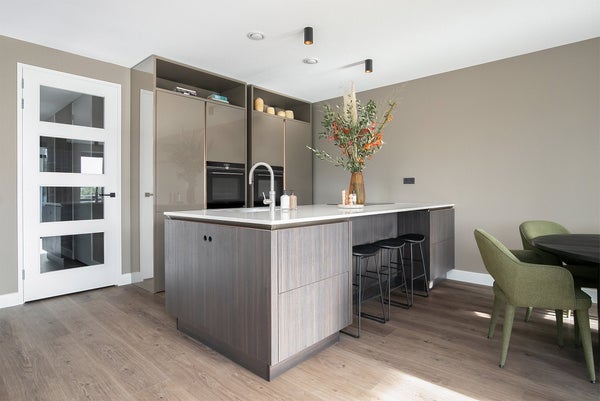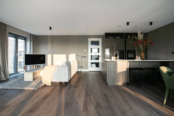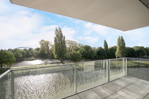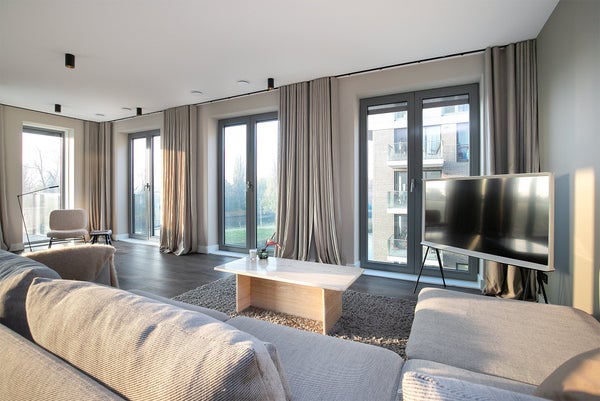 Il soggiorno ha una bella posizione aperta all'angolo del complesso. Le alte finestre con aperture a ribalta (con tende parasole elettriche!) portano molta luce all'interno. La cucina a vista SieMatic è dotata di un'isola di cottura con bar, rubinetto Quooker e piano cottura a induzione Siemens con estrazione integrata. Inoltre, la cucina è dotata di ampi spazi di stoccaggio, frigorifero-congelatore, lavastoviglie e 2 forni (a vapore) Siemens StudioLine di lusso. La spaziosa terrazza, esposta a sud, è accessibile tramite le 2 porte a battente ed offre una bella vista su molto verde e acqua (Amsterdam Rijnkanaal).
