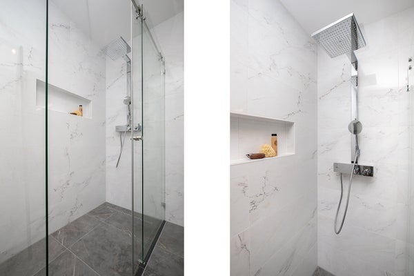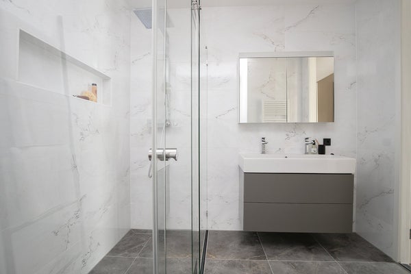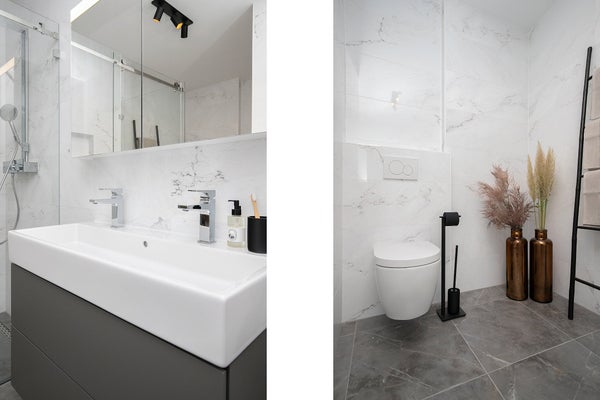 Il moderno bagno è dotato di una spaziosa doccia a piatto, piastrelle di lusso effetto marmo fino al soffitto, doppio lavabo e 2° wc.