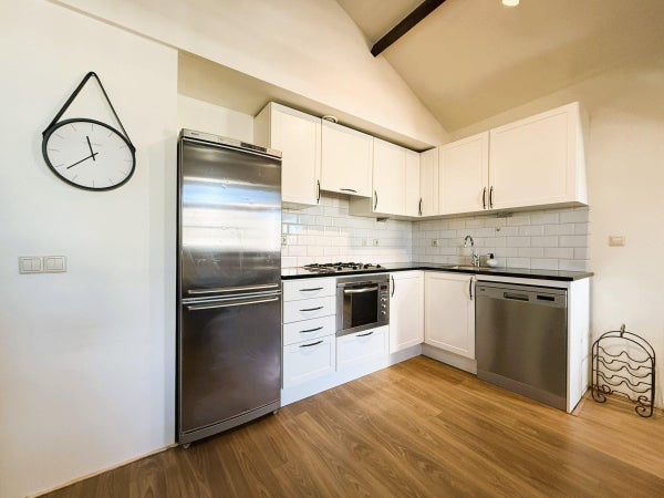 Si accede al terzo piano tramite l'ascensore. L'ampio corridoio offre accesso al luminoso soggiorno con cucina a vista moderna, dotata di elettrodomestici da incasso come frigorifero, congelatore, lavastoviglie, piano cottura a gas a 4 fuochi con cappa aspirante e forno combinato. L'appartamento dispone di due camere da letto: una camera matrimoniale con letto matrimoniale e una seconda camera ideale come camera per gli ospiti o ufficio. Il bagno è dotato di vasca, doccia separata e lavabo. Inoltre, c'è un wc separato con lavandino. Una scala dal corridoio conduce alla soleggiata terrazza sul tetto – perfetta per rilassarsi. Inoltre, troverai una lavanderia separata con lavatrice e asciugatrice, oltre a un ripostiglio nel seminterrato.