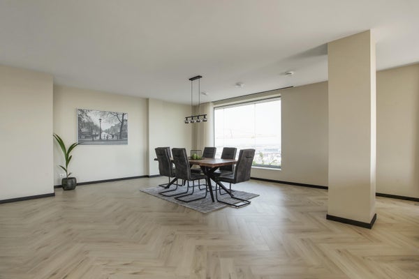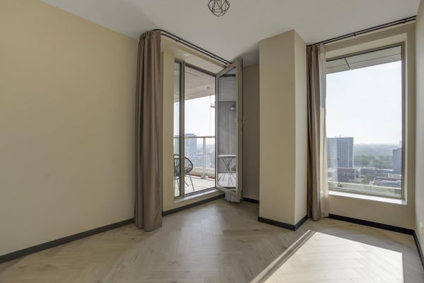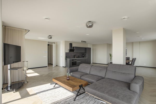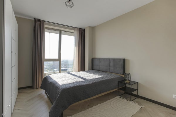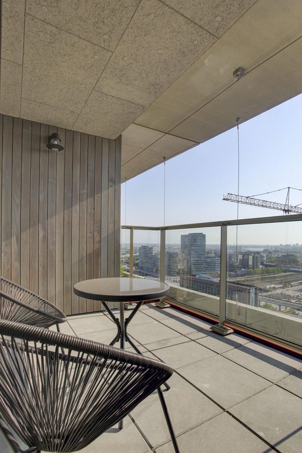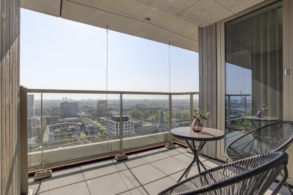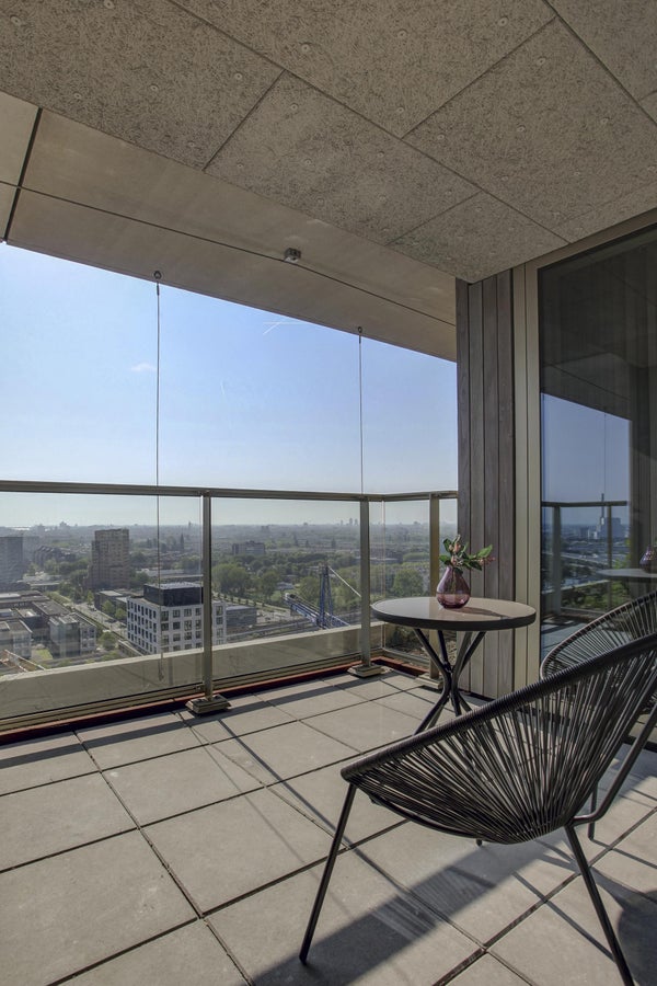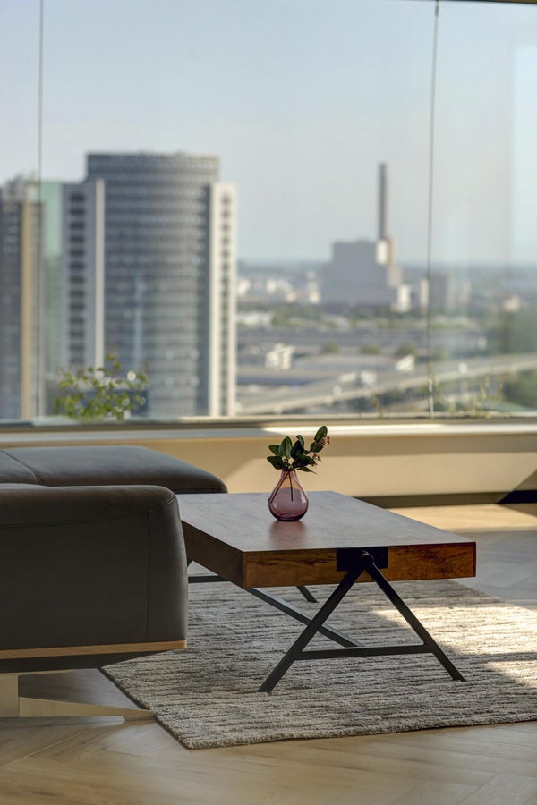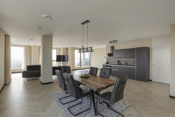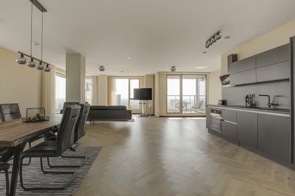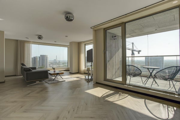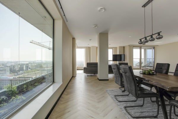 Appartamento molto esclusivo di 138 m2 con un ampio balcone di 7 m2 al 18° piano di Vertical. L'appartamento finemente arredato viene affittato completo di mobili, inclusi un posto auto e posti per le biciclette. La proprietà dispone di un soggiorno con finestre angolari di circa 75 m2 e due camere da letto.