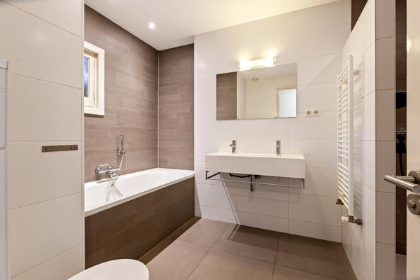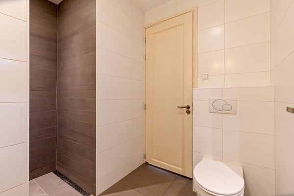 Questo appartamento al primo piano è accessibile tramite l'ingresso comune. Una scala interna porta al secondo piano dove si trovano le camere da letto e il bagno. Il bagno, situato centralmente in questo piano, è dotato di una spaziosa doccia a pioggia, vasca da bagno, doppio lavabo, radiatore per asciugamani e WC. Inoltre, c'è un WC separato con lavabo accanto al bagno. Entrambe le camere da letto sono posizionate sul retro dell'edificio e offrono accesso al balcone.