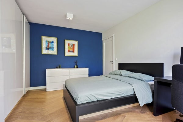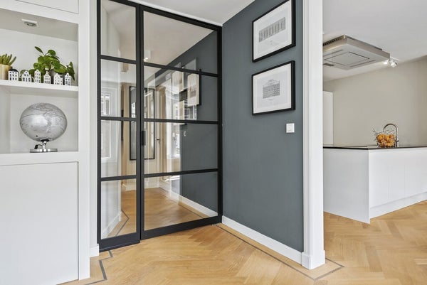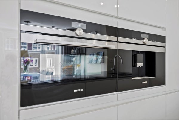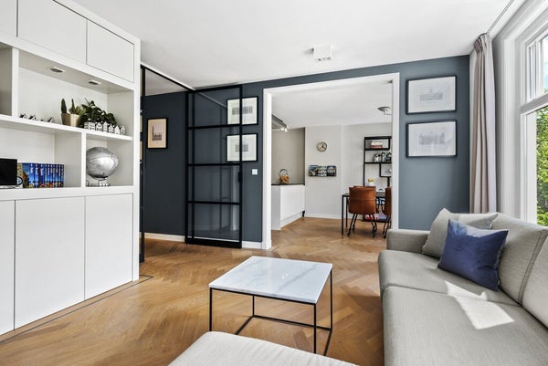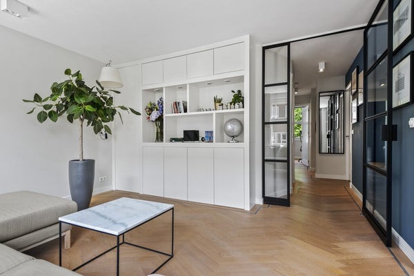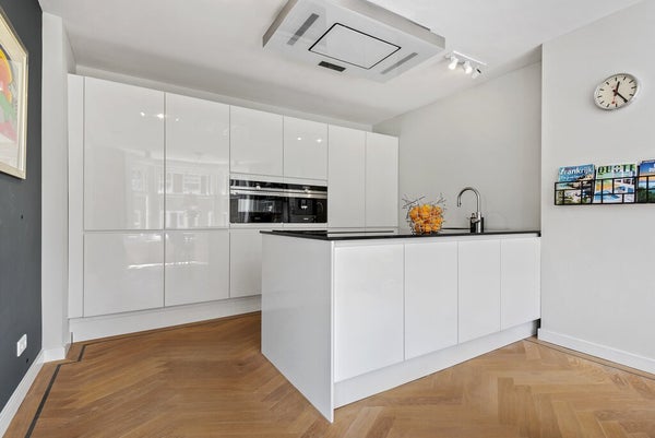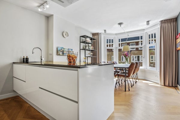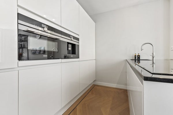 Il soggiorno, situato nella parte anteriore, si estende per tutta la larghezza dell'appartamento ed è un delizioso spazio abitativo luminoso. La lussuosa cucina a vista è dotata di elettrodomestici di alta qualità, tra cui una macchina da caffè, un forno a combinazione e un Quooker, e crea una splendida connessione con il soggiorno.