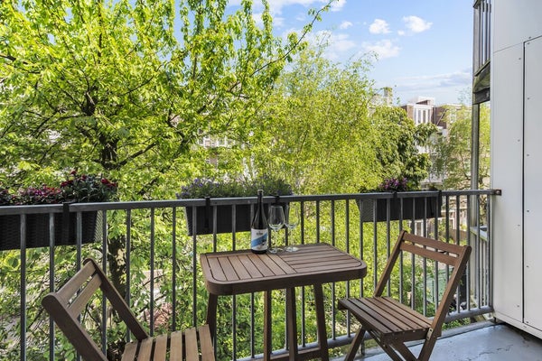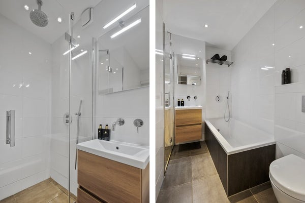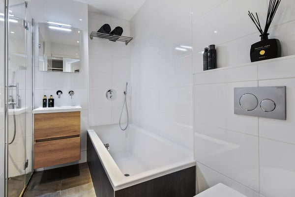 Nella parte posteriore si trovano due camere da letto di circa 18 m² e 9 m², tranquille e luminose grazie al doppio vetro. Il bagno è lussuosamente arredato con una doccia a pioggia, vasca e lavandino, mentre il WC separato offre ulteriore comfort. Tutto l'appartamento è dotato di un bel pavimento a spina di pesce e di tende sottili, che contribuiscono alla finitura di alta qualità.