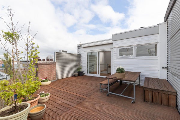 Un soppalco si affaccia sull'area living, aggiungendo carattere. Questo piano include anche una stanza che può essere utilizzata come terza camera da letto o ufficio con una piccola cucina, perfetta per gli ospiti o per lavorare da casa, insieme a una spettacolare terrazza sul tetto di 33 m². Questo spazio esterno privato, baciato dal sole, offre bellissime viste sulla città.