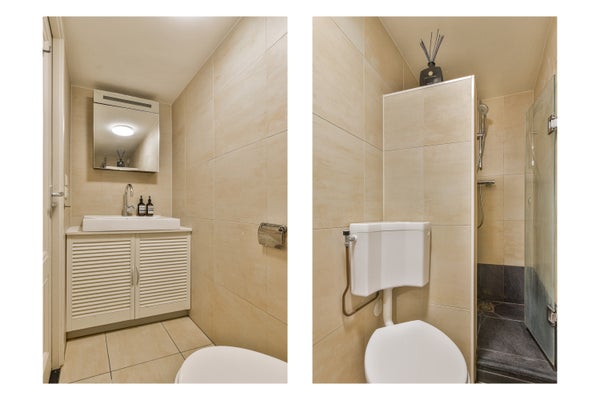 La porta dell'appartamento può essere chiusa a chiave separatamente. Si entra nella proprietà attraverso un corridoio che porta al soggiorno con cucina a vista, ma dà anche accesso al bagno. Il bagno è dotato di un lavabo con mobile, un wc e una doccia a pioggia.