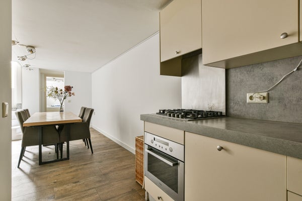 Il soggiorno con cucina a vista è dotato di un pratico tavolo da pranzo, che, grazie alle sue dimensioni, offre ancora spazio per creare un'area salotto nella casa. La cucina a vista è dotata di una cucina a gas con cappa aspirante, un frigorifero e una lavastoviglie.