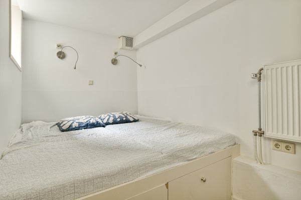 Il soggiorno è piacevolmente luminoso grazie alle porte che si aprono sul patio. Un piccolo corridoio offre spazio per il riscaldamento centrale, dietro il quale si trova la camera da letto. Questa è dotata di due armadi aperti e di un letto matrimoniale a scomparsa. Sotto il letto ci sono due cassetti che offrono ulteriore spazio di archiviazione.