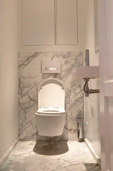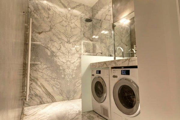 Il soggiorno è dotato di un piacevole camino, mobili di lusso e un tavolo da pranzo con sedie. La camera matrimoniale si trova sul lato tranquillo dell'edificio e offre ampio spazio per riporre, un letto king-size e una TV. La seconda camera da letto è adatta come camera per gli ospiti, camera dei bambini o studio. In questo piano si trova anche il lussuoso bagno in marmo con doccia a filo, lavabo in marmo doppio, rubinetti di design e lavatrice e asciugatrice. Toilette separata. L'appartamento è anche dotato di aria condizionata, attrezzature Sonos e un sistema di allarme.
