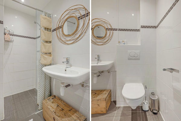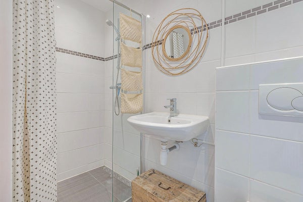 Il bagno modesto è accessibile dal corridoio ed è dotato di un WC, doccia a filo, radiatore per asciugamani e lavabo.