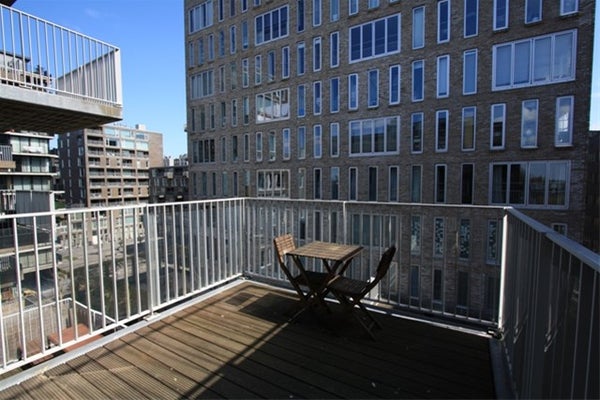 Dal soggiorno hai accesso al ampio balcone, dove puoi rilassarti e godere della vista sul Westerdok.