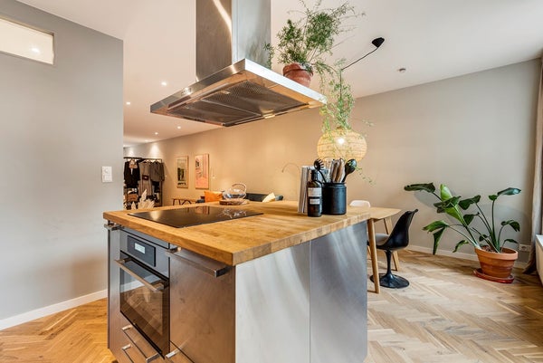 Ingresso nell'appartamento al primo piano tramite le scale comuni nella spaziosa zona giorno. Sul retro dell'appartamento (lato sole a sud), troverai la bellissima cucina open space e la zona pranzo con porte a soffietto. L'interno luminoso, i mobili di design e le grandi finestre rendono l'appartamento calmante e accogliente. In tutto l'appartamento c'è un bellissimo pavimento in legno a pesce.