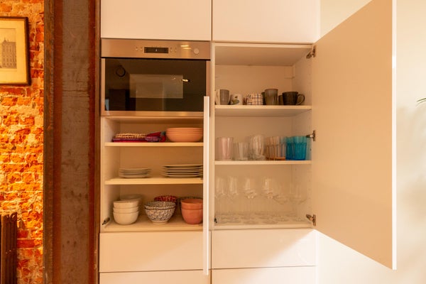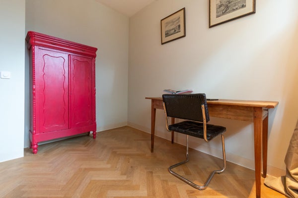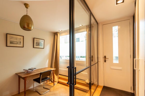 L'immobile ha un ingresso privato. All'ingresso, sulla destra si trova una stanza versatile, attualmente arredata come ufficio domestico. Grazie alle grandi finestre sul lato strada, questa stanza gode di molta luce naturale ed è adatta come spazio di lavoro o seconda camera da letto. Nel corridoio ci sono un armadio e un bagno separato. La finitura è composta da un pavimento in legno a spina di pesce e da un caratteristico muro di mattoni.