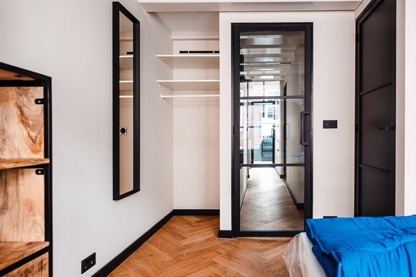 Entrate in un corridoio che offre accesso a due camere da letto, al bagno e a un bagno separato. Il lussuoso bagno è rifinito con materiali di alta qualità e dispone di una vasca da bagno, una spaziosa doccia a pioggia, un radiatore per asciugamani e un lavabo con mobile.