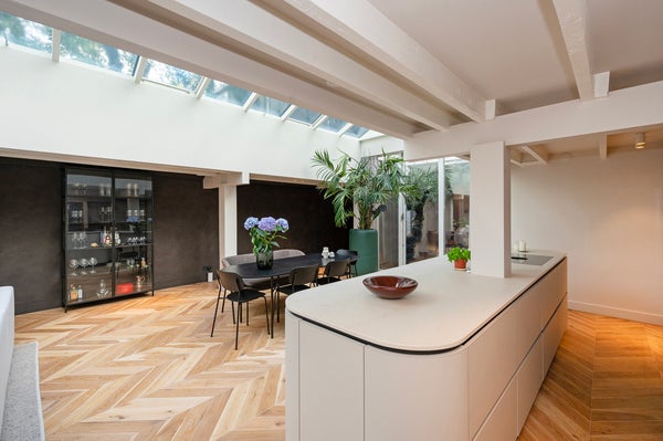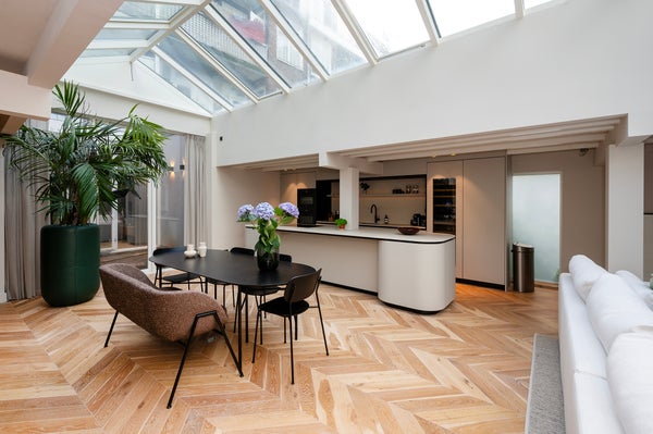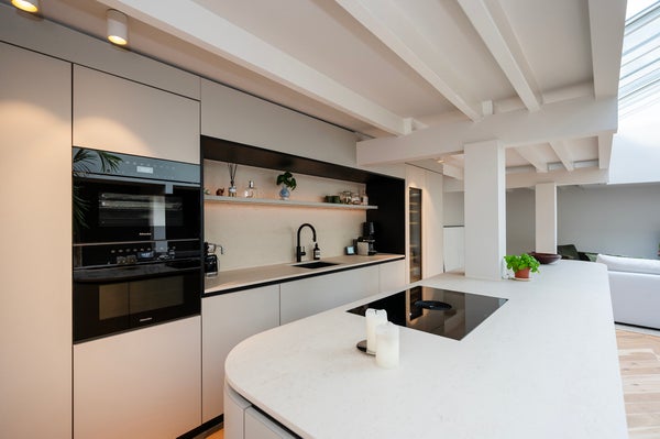 La cucina è completamente attrezzata con elettrodomestici da incasso di alta qualità, come un frigorifero per vini, lavastoviglie, forno (a vapore), microonde, combinazione frigo-congelatore e piano cottura a induzione.