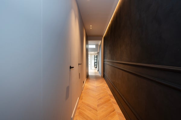 Entrate nel corridoio che dà accesso a tutte le stanze. Nella parte posteriore della casa si trova il soggiorno con cucina a vista. Il luogo più unico di questo appartamento.