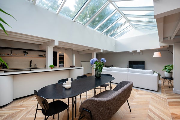 Il soggiorno con cucina a vista è dotato di ampie finestre e lucernari, che garantiscono una splendida luce durante tutto il giorno.