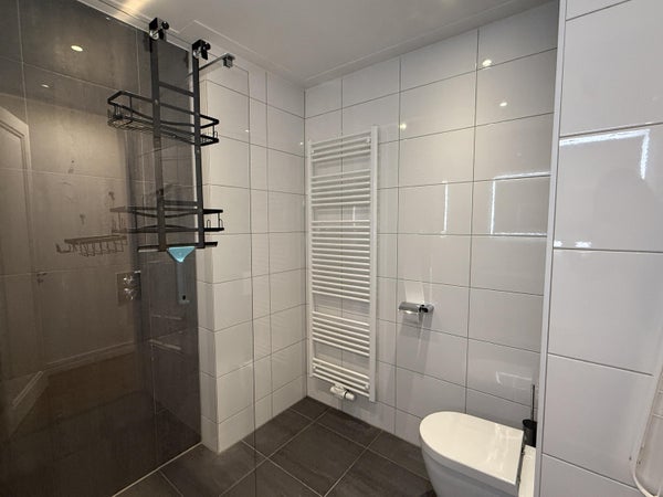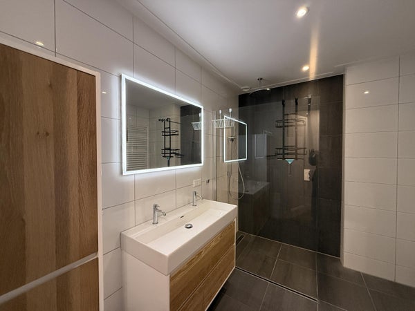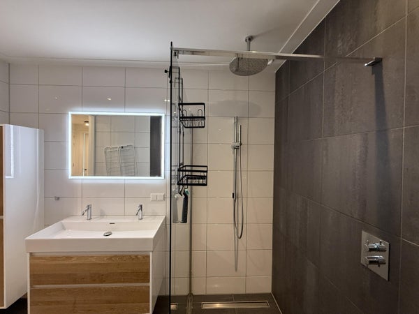 Nel centro dell'appartamento si trova il moderno, spazioso bagno, dotato di tutte le comodità. Davanti si trova il generoso soggiorno con cucina a vista. Grazie alle grandi finestre, questo è uno spazio abitativo eccezionalmente luminoso e confortevole. La cucina a vista è completamente attrezzata e offre ampie opportunità per gli appassionati di cucina.
