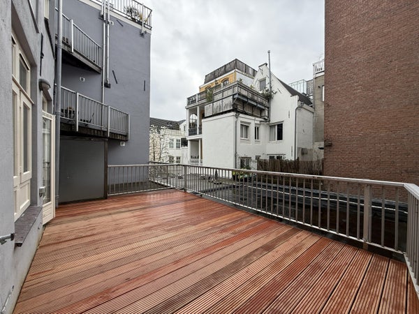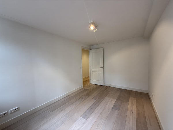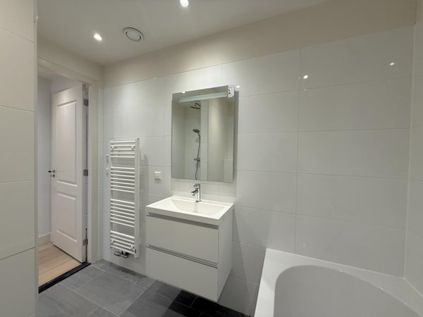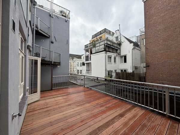 Entrata nel corridoio con accesso a tutte le stanze. Nella parte anteriore si trova un soggiorno luminoso con cucina a vista. Lo spazio è di dimensioni gradevoli e grazie alle grandi finestre entra molta luce naturale. La cucina moderna è realizzata in modo elegante ed è dotata di vari elettrodomestici integrati. Nella parte posteriore tranquilla ci sono due camere da letto ben dimensionate di 11 m² e 9 m², entrambe con porte finestre che conducono alla spaziosa terrazza. Questo delizioso spazio esterno si estende per tutta la larghezza della proprietà e offre ampio spazio per sedersi e godere. Il bagno è rifinito modernamente ed è dotato di vasca, doccia, mobile lavabo e radiatore per gli asciugamani. Toilette separata dal corridoio.