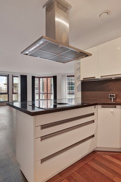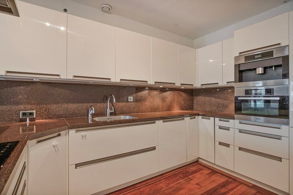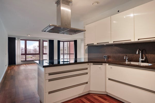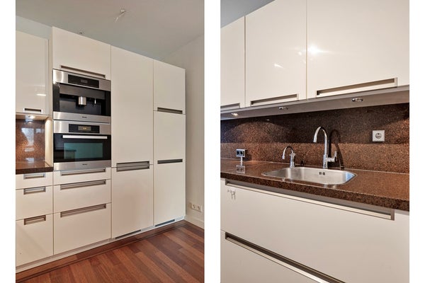Dal corridoio si accede al soggiorno molto ampio e luminoso con una vista splendida da ogni parte. La cucina aperta a forma di U è dotata di vari elettrodomestici moderni di Miele, tra cui: frigorifero, congelatore, piano cottura a induzione, macchina per caffè, Quooker e cappa. Dal soggiorno si accede alla seconda camera da letto/studio.